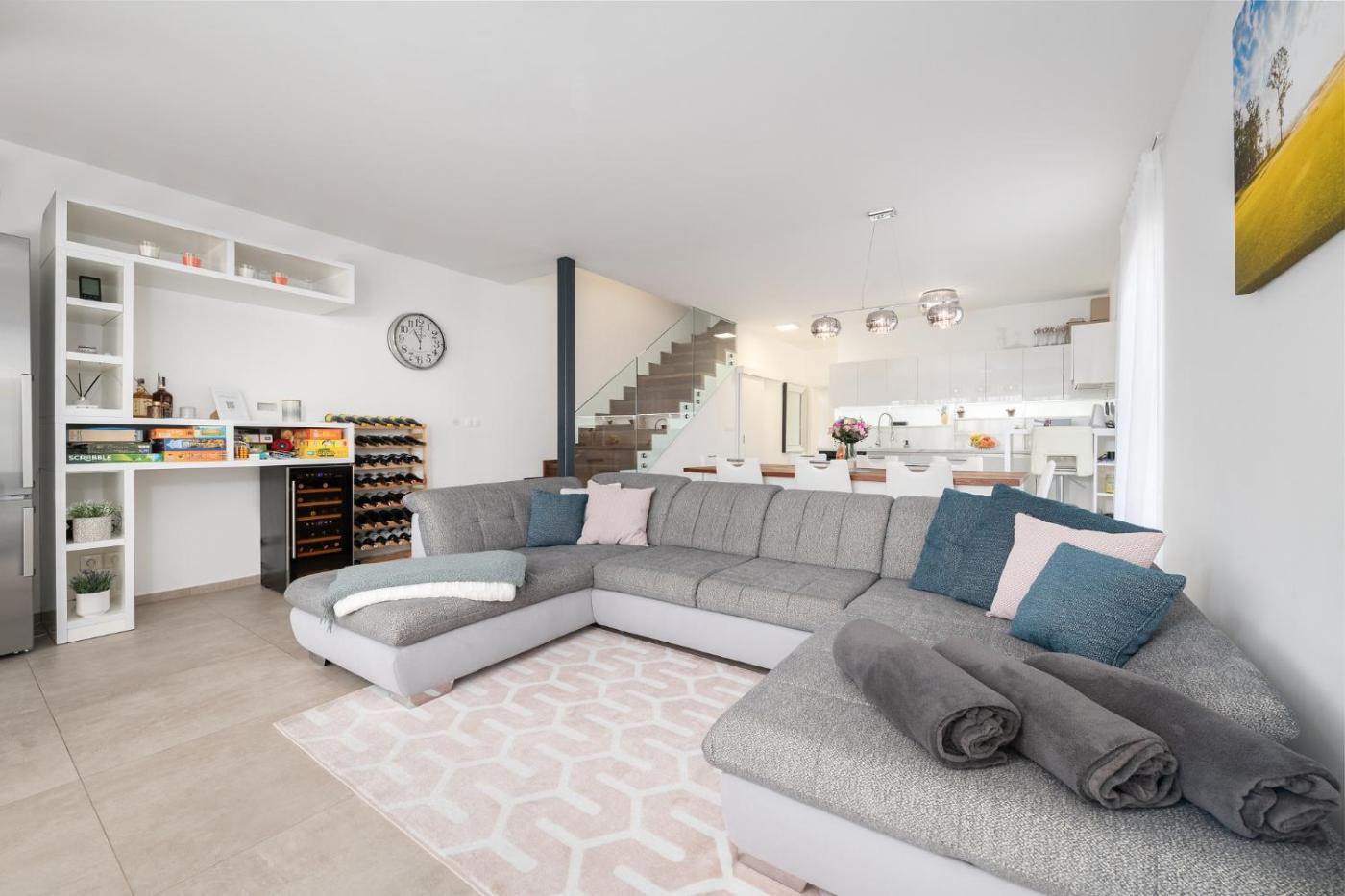 Three-Bedroom Villa. Featuring a private entrance, this villa consists of 1 living room, 3 separate bedrooms and 2 bathrooms with a bath and a shower. Guests will find a stovetop, a refrigerator, a dishwasher and kitchenware in the fully equipped kitchen. The villa also offers a barbecue. The unit features a washing machine, lake views, a terrace and winechampagne is provided for guests. The unit offers 5 beds.